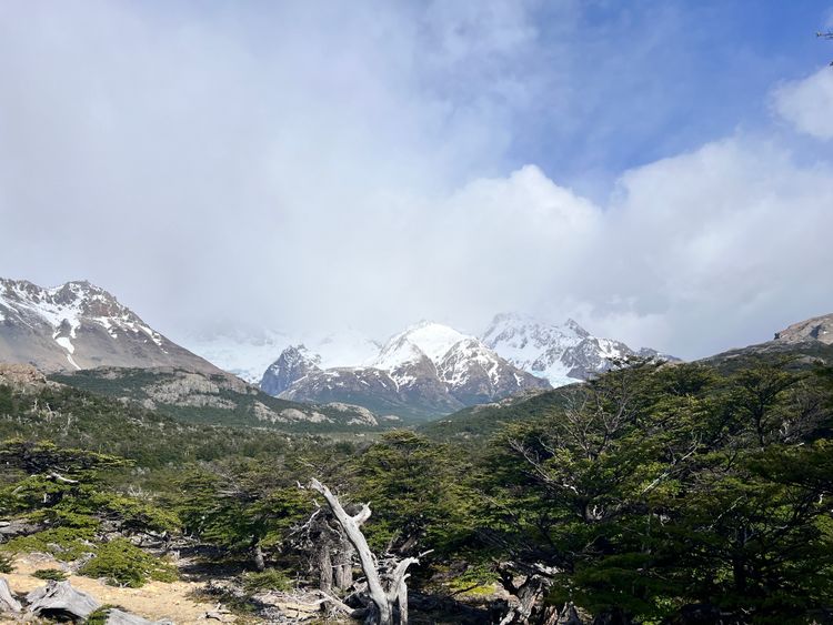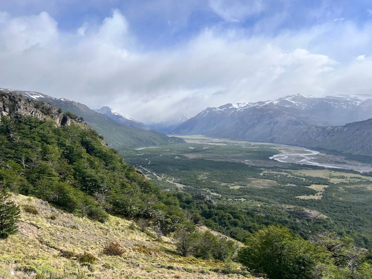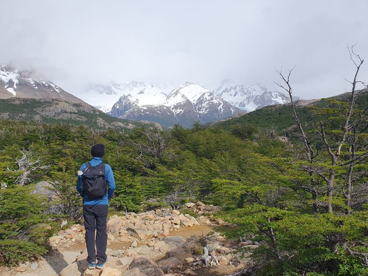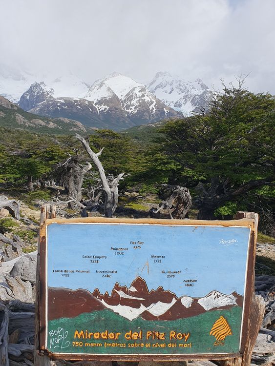 Der größte Teil der Strecke ist absolutes Genusswandern. Bald sehen wir schroffe Berghänge und Gletscherfelder. Nach 5km kommen wir zum Mirador (Aussichtspunkt) Fitz Roy und sehen... tja, wir sehen Natur ringsum, aber nicht den erwünschten Berg. Und so wird es leider bleiben.