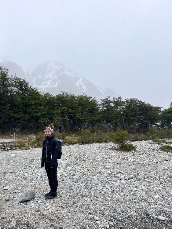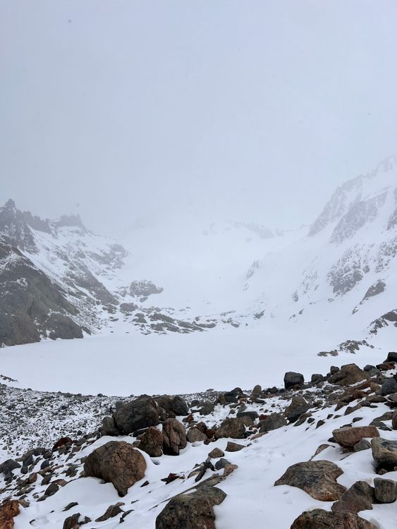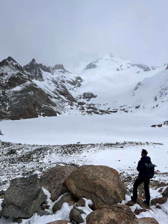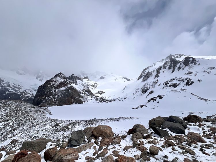 Nach 11 km gelangen wir an den See zu Fuße des Fitz Roys. Er ist zugefroren, auf dem Eis liegt eine dicke Schneedecke. Blicken wir ringsum, sehen wir weiße Wolkenwände, die ab und zu ein paar Felswände und Bergspitzen durchblitzen lassen. Während der gesamten Wanderung haben uns Schneeflocken begleitet, bis zum Schluss haben wir auf die Stärke der Sonne und des Windes gehofft... vielleicht reißt es auf, vielleicht verbläst der starke Wind die Wolken. Tja, diesmal leider kein Glück. Aber interessant zu erleben, so kann eben ein Sommerbeginn in Patagonien sein.